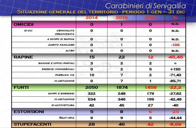 Diminuiscono i reati tentati o consumati, scesi dai 3850 del 2013 ai 2485 del 2016. Calano i furti commessi che passano dai 2100 di tre anni fa ai 1458 dell’anno scorso (-22,19%). E sono in flessione le rapine che dalle 12 nel 2014,si riducono alle 9 degli ultimi 12 mesi (-52,6%), configurabili, per lo più, come furti con violenza trasformati in rapine improprie. La criminalità è sotto controllo a Senigallia e i dati rilevano un decremento generale sull’andamento dei reati anche denuncianti pari a – 6,30% rispetto al 2015. Sono quindi più che confortanti le statistiche relative all’attività operativa rielaborate dalla Compagnia dei carabinieri, che comprende sotto la sua giurisdizione anche i Comuni di Montemarciano, Trecastelli, Corinaldo, Ostra, Ostra Vetere, Belvedere Ostrense, Barbara e Castelleone di Suasa.