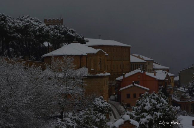 l centro storico di Osimo ieri sera sotto la neve (foto Bruno Severini)
