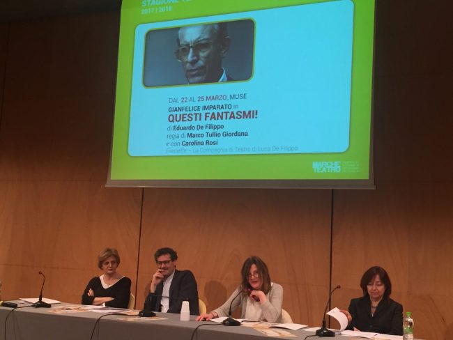 La presentazione della stagione di prosa, da destra la direttrice Velia Papa, la presidente di Marche Teatro Gabriella Niccolini, l’assessore alla cultura Paolo MarascaLa vedova scaltra, alle Muse dal 5 all’8 aprile, rappresenta non soltanto uno dei momenti altissimi e divertenti della commedia goldoniana, ma soprattutto il simbolo del cambiamento dell’autore, che dal teatro delle maschere passa a quello dei personaggi presi dal reale. Ancora commedia dal 14 al 17 dicembre alle Muse con L’anatra all’arancia, spettacolo cult del teatro comico, con Luca Barbareschi, che ne cura anche la regia, e Chiara Noschese. Celebre la versione cinematografica che vantava l’interpretazione di Ugo Tognazzi e Monica Vitti. Dal 22 al 25 marzo le Muse tornano a ospitare la compagnia di Luca De Filippo diretta ora da Carolina Rosi con Questi fantasmi! di Eduardo con la regia di Marco Tullio Giordana e protagonista Gianfelice Imparato. In perfetto equilibrio tra comico e tragico, propone uno dei temi centrali della drammaturgia eduardiana, quello della maschera imposta agli uomini dalle circostanze. Dal 30 novembre al 3 dicembre al Teatro delle Muse arriva La guerra dei Roses dal romanzo di Warren Alder diretto da Filippo Dini, con Ambra Angiolini nella parte che fu di Kathleen Turner nel film di successo di Danny De Vito. Ma il sipario delle Muse si alza il 19 ottobre (e fino al 22) con il musical Mamma mia! con musiche e testi di Benny Andersson, Bjorn Ulvaleus e Stig Anderson, nel nuovo allestimento diretto da Massimo Romeo Piparo e le musiche eseguite dal vivo da un’orchestra. Per gli abbonati alla stagione in corso è possibile rinnovare da subito l’abbonamento imbucando in un’apposita urna il tagliando distribuito alle repliche di Chi ha paura di Virginia Woolf? Fino al 5 maggio il tagliando può essere anche consegnato in biglietteria o spedito in via della loggia 1/d, oltre che inviarlo via mail a biglietteria@teatrodellemuse.org o info@marcheteatro.it. Dal 10 al 23 maggio ritiro abbonamenti stesso posto e turno, dal 6 al 10 giugno cambio di posto e/o turno, dal 17 giugno nuovi abbonamenti (info 071 52525, biglietteria@teatrodellemuse.org, www.marcheteatro.it).