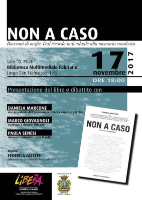 Sarà presentato venerdì 17 novembre, alle 18, alla Sala Dalmazio Pilati della biblioteca multimediale Fabriano R. Sassi Non a caso (Edizioni la meridiana), il libro curato da Daniela Marcone, vice presidente dell’associazione Libera Contro le Mafie e figlia di Francesco Marcone, direttore dell’Ufficio del Registro di Foggia assassinato nel marzo del 1995. Il volume raccoglie storie di vittime pugliesi delle mafie raccontate da noti scrittori della letteratura italiana contemporanea. L’incontro è promosso dal presidio cittadino Libera Fabriano, n occasione del weekend regionale di tesseramento per l’anno 2018, con il patrocinio del Comune di Fabriano.