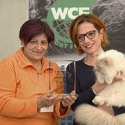 Horus Heka, campione del mondo 2016, in braccio alla proprietaria Loredana Baldinelli, Il gatto con il blasone dell’allevamento Horus di Castelfidardo è il campione WCF 2016