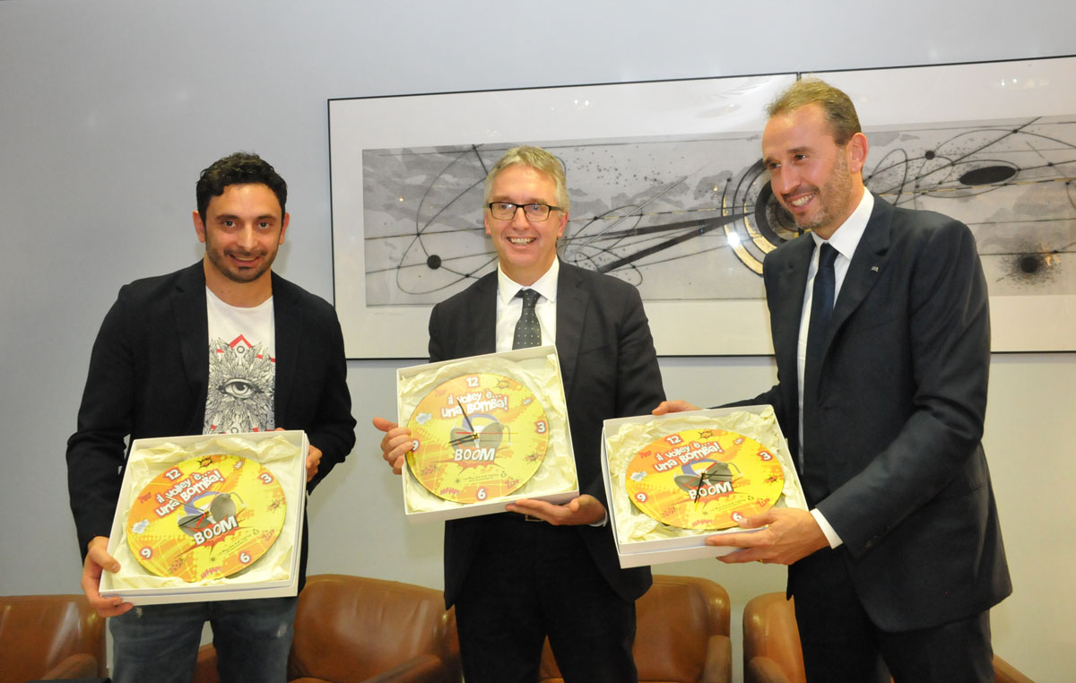 Da sinistra Davide Mazzanti ct della nazionale di pallavolo femminile, il presidente della Regione Luca Ceriscioli, e l’arbitro federale Fabrizio Pasquali