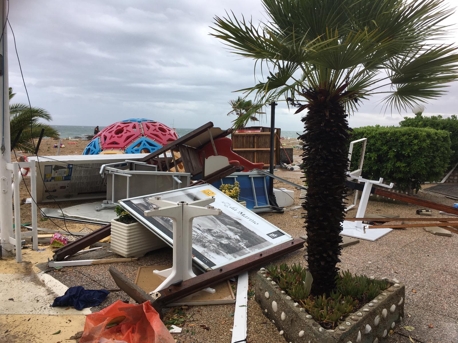 Tra i tanti danni provocati dalla tromba d’aria che si è abbattuta sulla costa adriatica martedì pomeriggio (9 luglio) emerge il dramma della spiaggia di Numana dove cinque stabilimenti e mezzo sono stati devastati dalla furia del fenomeno. Esattamente cinque e mezzo, dal momento che – e la cosa è veramente incredibile – il tifone ha diviso a metà lo stabilimento Bellariva: una parte è stata devastata mentre una parte è rimasta pressoché intatta, a dimostrare quanto sia stata chirurgica l’azione dell’uragano. Danni e distruzione registrati anche negli stabilimenti da Marino al Cavalluccio. Una prima ricognizione è stata fatta direttamente dal Direttore Confcommercio Marche Massimiliano Polacco che nella prima mattinata di oggi è andato a Numana per verificare di persona l’entità del disastro, incontrando gli operatori.