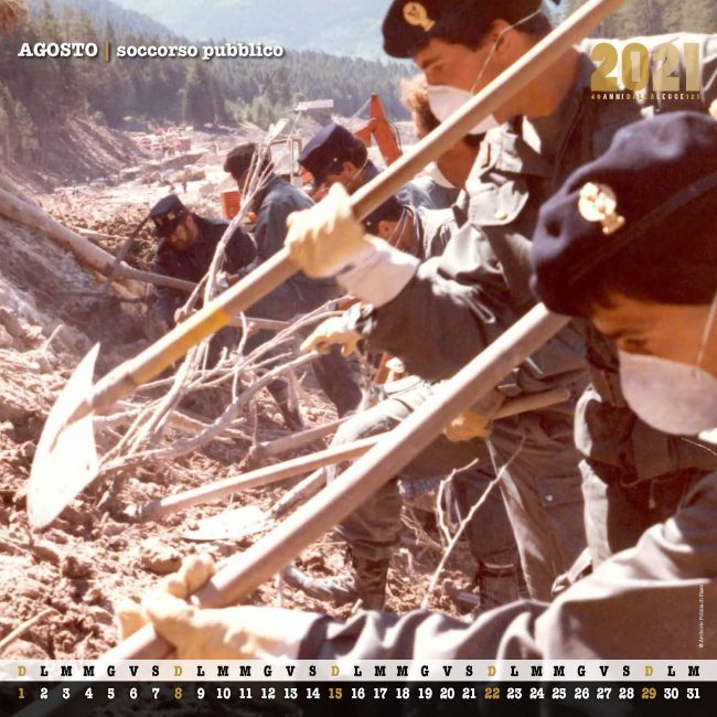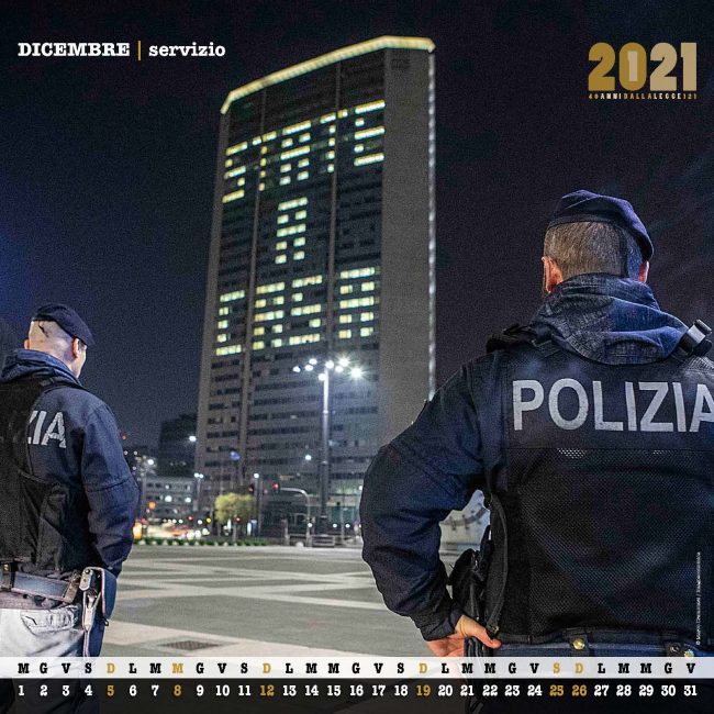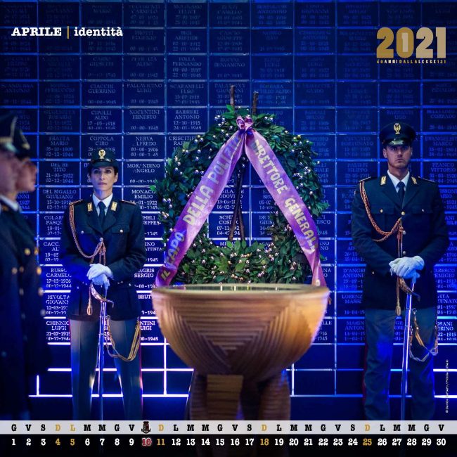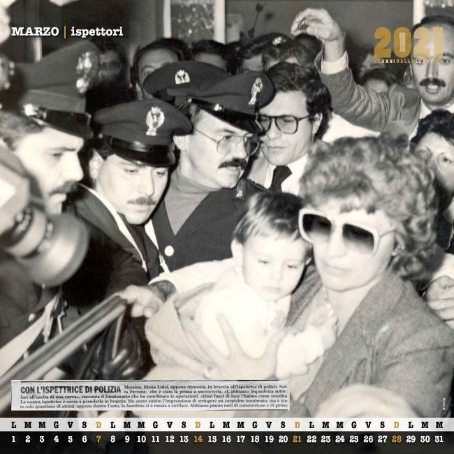 Tre immagini, in particolare, simboleggiano lo spirito di servizio: il mese di marzo con l’ispettore Santa Perrone e la piccola Elena Luisi salvata dai suoi rapitori, il mese di agosto con il reparto mobile che presta soccorso agli abitanti della Val di Fiemme, il mese di dicembre con i poliziotti impegnati nell’attività connessa all’emergenza Covid a salvaguardia della salute pubblica.