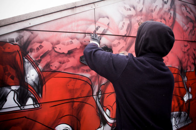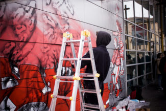 Yuri Romagnoli, in arte Hopnn durante il murale in piazza Ugo Bassi
