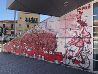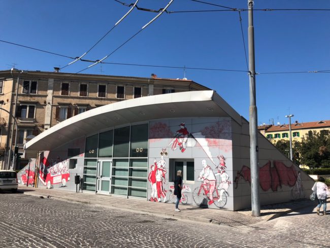 La sua ‘firma’ è anche ad Ancona, in piazza Ugo Bassi. Suo, infatti, il murale lungo tutti i toroidi.