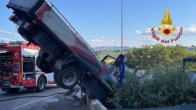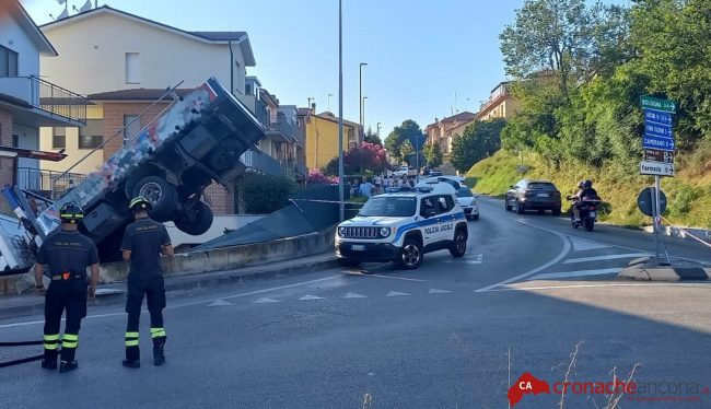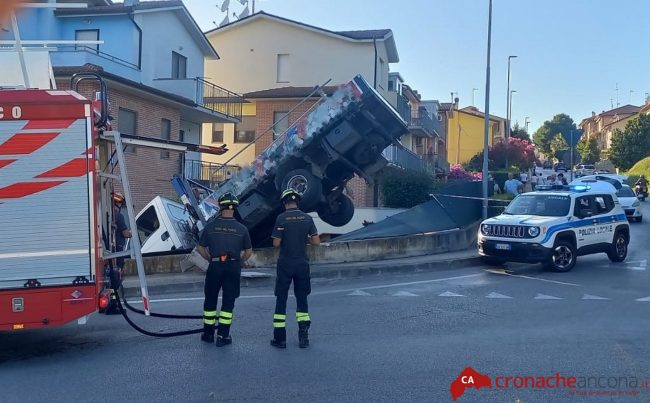 E’ avvenuto intorno alle 19 quando un autocarro, per cause in corso di accertamento da parte della polizia locale, intervenuta sul posto insieme ai vigili del fuoco di Osimo, è uscito di strada all’altezza della rotatoria via Brandoni – via Nobel, località Crocette.