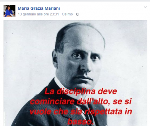 Ha postato sul suo profilo fb una foto del Duce con la massima “La disciplina deve cominciare dall’alto se si vuole che sia rispettata in basso” sollevando l’indignazione della Rete e movimentando la domenica virtuale di Osimo. I primi a puntare l’indice contro il post della capogruppo di minoranza Maria Grazia Mariani (gruppo misto) sono stati i colleghi d’aula del gruppo Pd. I consiglieri democrat di Osimo hanno subito condannato con forza il gesto “che arriva a pochi giorni dalla ricorrenza della Giornata della Memoria, in commemorazione delle vittime dell’Olocausto” hanno scritto in un comunicato ufficiale.