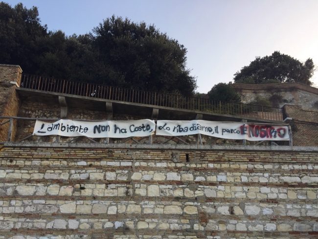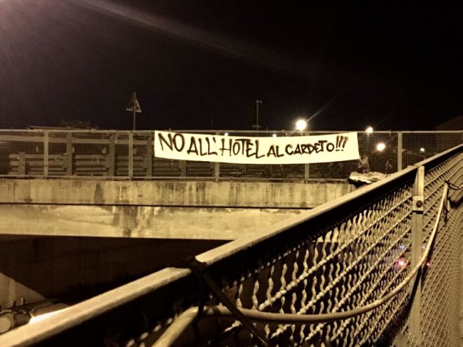 Blitz nella notte delle associazioni A2O, Ora e spazio comune Heval per fermare il progetto dell’albergo all’ex Caserma Stamura nel cuore del parco del Cardeto. Le tre associazioni hanno esposto striscioni nei punti più visibili della città, ribadendo il messaggio. L’idea dell’hotel a due passi dal faro è stata ribadita la scorsa settimana dal sindaco Mancinelli (leggi l’articolo), che ha confermato come l’ipotesi stia andando avanti. Domani, giovedì 26, il sindaco ha in programma un incontro per convincere il Comitato Stamira, i cittadini che si sono riuniti per opporsi alla proposta.