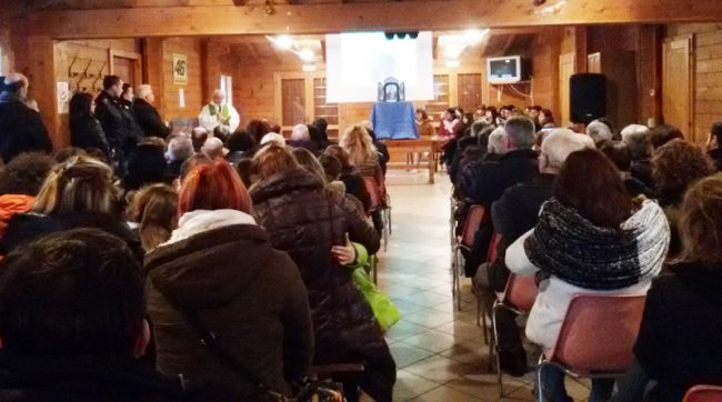 Centro sociale di San Paterniano di Osimo gremito, oggi pomeriggio, per la veglia di preghiera in ricordo di Domenico (Dino) Di Michelangelo e Marina Serraiocco, i due coniugi morti all’hotel Rigopiano. Don Luigi Filipponi ha invitato la comunità a non dimenticare la famiglia ed il bambino, a continuare a pregare per loro e stare vicino ai parenti, “a non agire come gli amici di Lazzaro”. Per questo, al termine dell’incontro di riflessione e preghiera organizzato al centro sociale della frazione dall’associazione Insieme per San Paterniano, il sacerdote ha consegnato ai presenti una candela da accendere a casa.