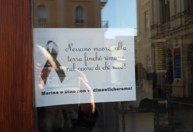 Il messaggio di cordoglio che alcuni commercianti del centro storico hanno esposto sulle vetrine per ricordare Dino e Marina, titolare di un negozio di bomboniere proprio in Corso Mazzini e attivista del Coc, il comitato dei negozianti dentro le mura