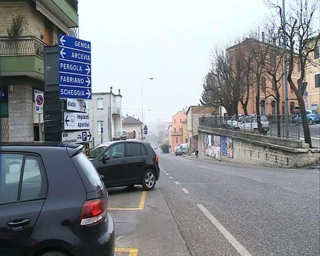 Sassoferrato, via Bruno Buozzi, teatro dell’omicidio. L’asfalto porta ancora i segni evidenti del sangue perso dalla vittima