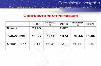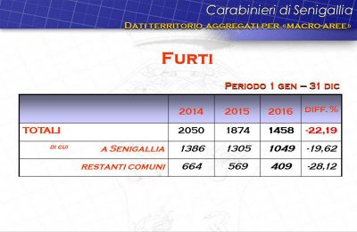 Diminuiscono i reati tentati o consumati, scesi dai 3850 del 2013 ai 2485 del 2016. Calano i furti commessi che passano dai 2100 di tre anni fa ai 1458 dell’anno scorso (-22,19%). E sono in flessione le rapine che dalle 12 nel 2014,si riducono alle 9 degli ultimi 12 mesi (-52,6%), configurabili, per lo più, come furti con violenza trasformati in rapine improprie. La criminalità è sotto controllo a Senigallia e i dati rilevano un decremento generale sull’andamento dei reati anche denuncianti pari a – 6,30% rispetto al 2015. Sono quindi più che confortanti le statistiche relative all’attività operativa rielaborate dalla Compagnia dei carabinieri, che comprende sotto la sua giurisdizione anche i Comuni di Montemarciano, Trecastelli, Corinaldo, Ostra, Ostra Vetere, Belvedere Ostrense, Barbara e Castelleone di Suasa.