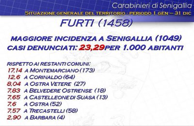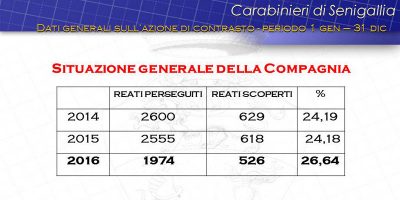 DENUNCE E ARRESTI – Curiosando ancora tra i numeri emerge poi che nel 2016 le persone denunciate sono state 476 (172 dei quali stranieri) quelle arrestate 77 (49 colte in flagranza di reato, 28 su mandato dell’autorità giudiziaria). Di queste, 34 erano stranieri (pari al 44%). In totale, negli ultimi 12 mesi i reati perseguiti sono stati 1974, quelli scoperti 526 (pari al 26,64% rispetto al 2014) mentre sono stati denunciati 2485 reati (-24,53 rispetto a 2 anni fa). Un bilancio positivo per i militari dell’Arma coordinati dal capitano Cleto Bucci che ha messo in campo un ventaglio di servizi esterni tra pattuglie, perlustrazioni, posto di blocco, servizi di ordine pubblico e di polizia giudiziaria, controllo targhe e mezzi con le nuove tecnologie, grazie all’ausilio di 6228 pattuglie e all’impiego di 12.344 militari. Una task force che nel coordinamento con le altre forze di polizia, ha sconsigliato ai malintenzionati di colpire nel territorio senigalliese e nel suo hinterland.