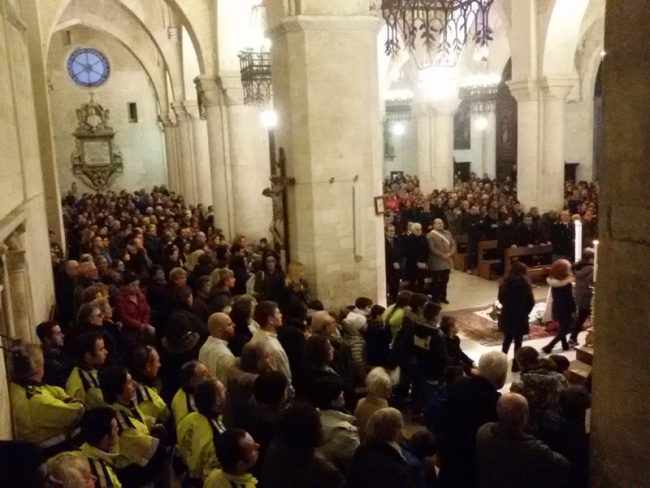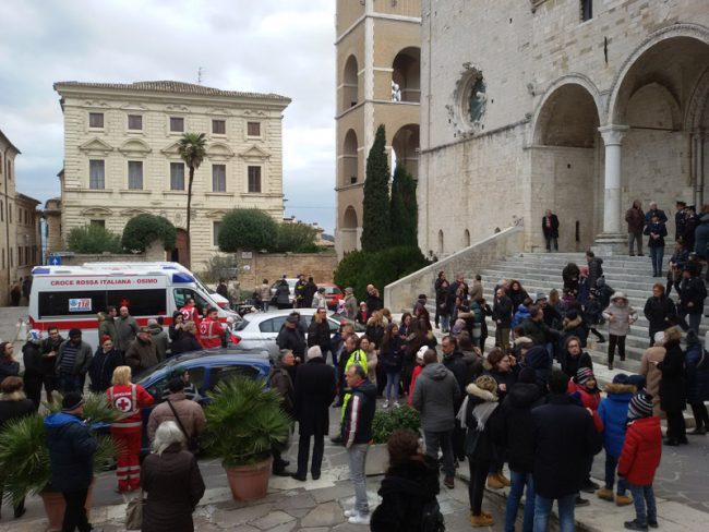 Duomo gremito alla messa in memoria di Domenico Di Michelangelo e Marina Serraiocco, la coppia uccisa dalla valanga che si è abbattuta sull’hotel Rigopiano. Ad officiare la celebrazione, il cardinale e arcivescovo di Ancona-Osimo, Edoardo Menichelli. Domenico, per gli amici Dino, e Marina vivevano insieme a Samuel, il figlio di 7 anni, scampato alla tragedia di Rigopiano, da qualche anno a Osimo dopo essersi trasferiti da Chieti. Da subito partecipi della vita della cittadina dell’Anconetano. Agente del commissariato di Osimo lui, commerciante lei. Tutta la comunità osimana oggi (sabato, 4 febbraio) si è voluta stringere attorno ai loro familiari, per esprimere tutto il suo affetto e la sua vicinanza. Un calore che si è riversato nella cattedrale di San Leopardo. Accanto al sindaco Simone Pugnaloni, erano seduti il prefetto ed il questore di Ancona, i vertici delle forze dell’ordine cittadine e una nutrita delegazione di poliziotti in divisa arrivati in città sull’autobus della Polizia. Tra le navate che non sono riuscite a contenere tutti c’erano tanti bambini, scolari e compagni di scuola di Samuel, presente in città ma rimasto fuori dalla chiesa, durante la funzione religiosa, con lo zio Giuseppe, il fratello di Marina Serraiocco.
