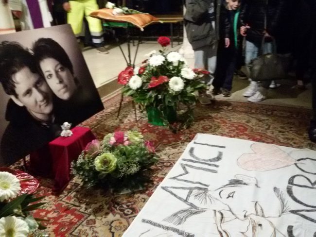 La gigantografia dei due coniugi morti sotto le macerie del Rigopiano sistemata davanti all’altare dagli ‘Amici del sacro’
