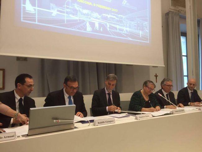 Al tavolo, insieme al ministro Graziano Delrio, il presidente Anas Gianni Vittorio Armani, il direttore commerciale ed eservizio di rete Rfi Giampiero Strisciuglio, il vice ministro Nencini, il presidente della Regione Ceriscioli, il presidente Ap Giamperi, il sindaco Mancinelli. Al centro dell’incontro, il protocollo di 8 pagine che impegnerà il ministero, Anas e Rfi a realizzare una serie di grandi opere attese da decenni: il raddoppio della statale 16, l’interramento del piede di frana della Palombella, il raddoppio della via Flaminia, lo spostamento della rete ferroviaria, quindi, infine, la nuova variante di collegamento tra il porto e la statale 16. Cestinati gli ultimi 20 anni di progettazione dell’Uscita Ovest, perché l’opera da 480 milioni più Iva è stata giudicata dal ministero insostenibile economicamente, si riparte da qui.