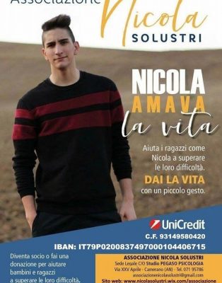 I genitori del ragazzo, che era uno sportivo, ed Alessandro Suardi, già direttore del centro di psicologia e psicoterapia ‘Pegaso’ che lo aveva seguito da piccolo per disturbi di apprendimento, hanno costituito un’associazione per mantenere vivo il suo ricordo. Un gesto d’amore che con il cuore hanno sostenuto per primi Andrea Solustri, padre di Nicola oggi presidente della onlus, e la mamma Fabiola Giaconi, in veste di segretario. L’associazione si è presentata ufficialmente il 2 ottobre 2016 con un evento al teatro La Nuova Fenice di Osimo.
