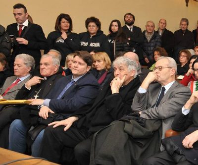 Il sindaco Lauretta Giulioni (seduta in seconda fila) ieri alla cerimonia di inaugurazione della mostra ‘Capolavori Sibillini)