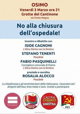 Si parlerà del futuro dell’ospedale di Osimo il prossimo 3 marzo alle 21, nella sala convegni delle Grotte del Cantinone di via Fontemagna. L’incontro pubblico organizzato da Partito Possibile (leggi l’articolo), Sinistra Unita, Pci e L’Altra Osimo con la sinistra, cercherà di mettere a fuoco quali scenari si prefigureraranno nei servizi per i cittadini utenti con la fusione giuridica tra Inrca e Ospedale di Osimo (leggi l’articolo). Il titolo del convegno ‘No alla chiusura dell’ospedale’ già racconta le preoccupazioni della sinistra che ha invitato a sedere tra il pubblico anche gli operatori dell’ospedale e le sigle sindacali che li rappresentano.