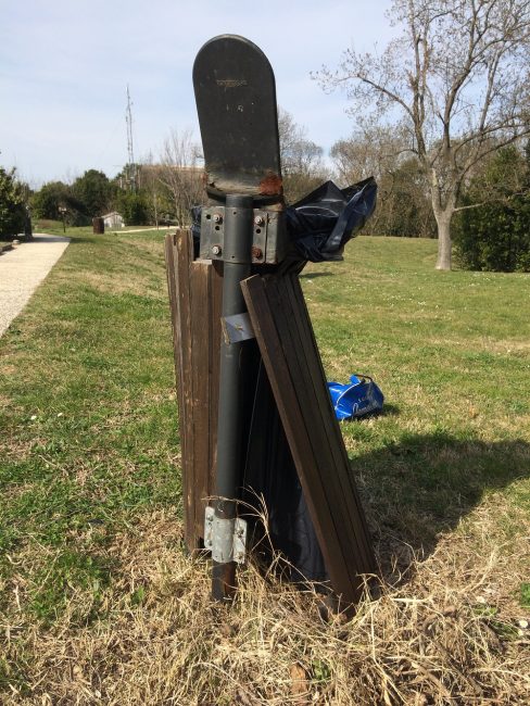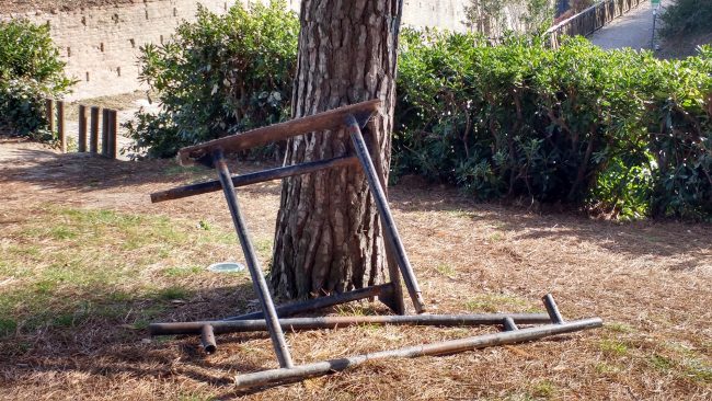 Le sbarre ginniche a pezzi e lasciate alla rinfusa