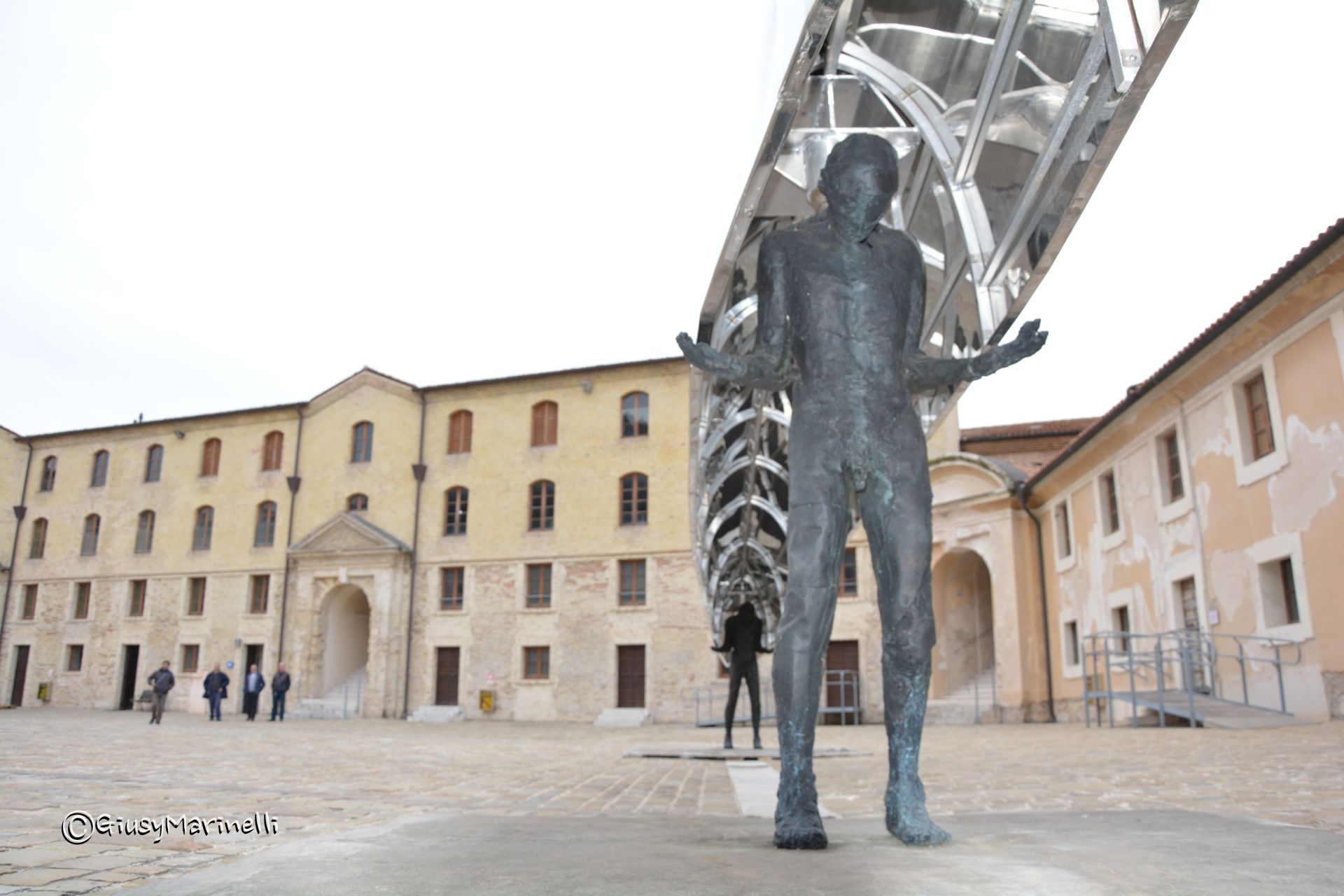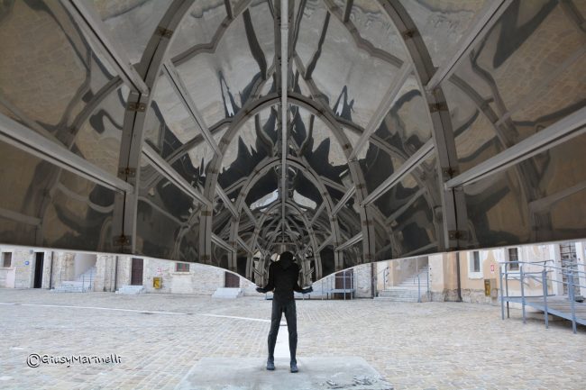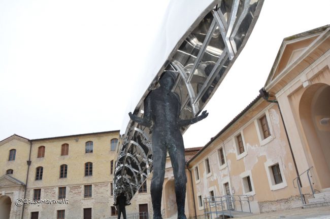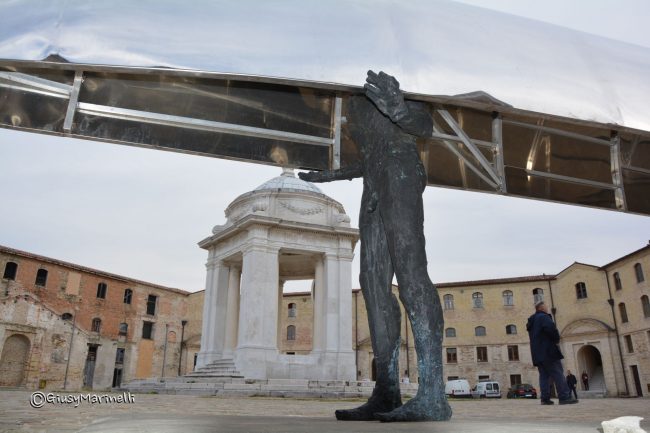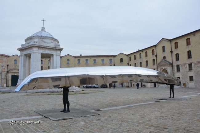 Quindici metri di scafo lucidato a specchio, il guscio argenteo della installazione scenografica di Velasco Vitali da oggi fanno mostra di sé nella corte interna della Mole, come arrivati da un altro mondo. E’ “Sbarco”, una delle due opere monumentali di arte contemporanea che durante l’intero 2017 saranno visibili gratuitamente negli spazi all’aperto del Lazzaretto. Installazione scenografica, come mostrano le foto e il video di Giusy Marinelli. Domani mercoledì 22 febbraio sono previste le ultime opere di finitura per l’allestimento, ma la scultura si può ammirare già da oggi nella Mole. L’altra opera attesa è il Cavallo di Mimmo Paladino, noto esponente della transavanguardia insieme a Enzo Cucchi e Achille Bonito Oliva. Altra opera di grande impatto, alta 4 metri, sarà issata sul marciaronda della Mole, lungo le mura esterne, e dovrà essere trasportata dal mare il 18 marzo. Al momento la scultura è in fase di restauro in uno dei cantieri navali del porto. Arte enigmatica e monumentale che riporta alla memoria l’esposizione sempre alla Mole della Calamita Cosmica di Gino De Dominicis. Il 23 marzo è in programma un incontro pubblico con Velasco Vitali, appuntamento con l’artista che sarà ripetuto anche con Mimmo Paladino, in data ancora da fissare. Per il Comune, l’allestimento delle due installazioni è in continuità con la mostra Ecce Homo e con il progetto per rendere la Mole un contenitore di cultura contemporaneo di livello nazionale (leggi l’articolo). Prossimo evento alla Mole, domenica l’inaugurazione di Icons, la mostra fotografica con 130 scatti di Steve McCurry (leggi l’articolo).