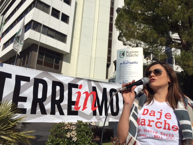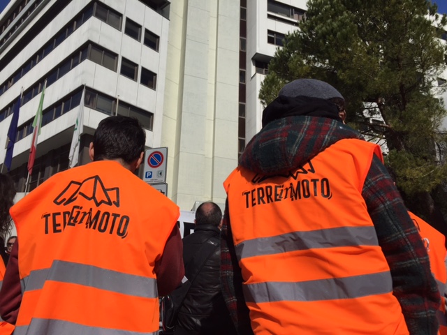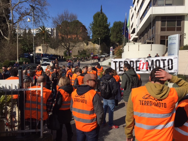 La rabbia dei terremotati irrompe a Palazzo Raffaello. “Vi serve una scossa” oppure “campa terremotato che la casetta cresce”, sono gli slogan sarcastici scritti su cartelli e striscioni rivolti alla giunta regionale e alle istituzioni in generale, accusati di quella che è stata definita una “strategia dell’abbandono” per far morire e spopolare definitivamente i luoghi colpiti dal sisma, tra ritardi e inefficienze. Un gruppo di un centinaio di manifestanti della rete “Terre in Moto” ha presidiato stamattina la sede della Regione per consegnare al presidente Ceriscioli il decalogo (leggi l’articolo) degli interventi non più rinviabili secondo il comitato che riunisce cittadini, associazioni e realtà sociali di tutte le zone colpite. Il governatore era fuori sede, solo la sua consulente per le attività economiche Sara Giannini si è affacciata per vedere cosa stesse succedendo e dopo un paio d’ore una delegazione dei manifestanti è stata ricevuta dal responsabile dell’ufficio della ricostruzione Cesare Spuri, dalla stessa Giannini e dal capo staff di Ceriscioli, Fabio Sturani.