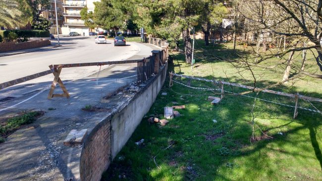 Procedendo verso il lato opposto dell’area “poco verde”, in cui esistono ancora, sebbene malandati, i giochi per i bambini, eccoci in un ampio angolo reso “off limits” dal Comune. Perché parte delle transenne in ferro che lo dividono dalla strada è sparito. Sostituite, alla buona, da una stecca di legno. Un lungo nastro bianco e rosso e una piccola impalcatura, anch’essa lignea, delimitano il “corner della vergogna”, costellato di mattoni e dalle solite cartacce. Una piazzetta-parco fantasma – sabato scorso, a metà mattinata, non c’era un’anima – collegata alla sovrastante via Scandali da una strada ridotta a sentiero-mulattiera. Percorrendola in salita, notiamo che resiste l’impianto sportivo, dove si aggirano dolo un cagnolino con relativa padrona. E da lassù non è proprio un belvedere.
