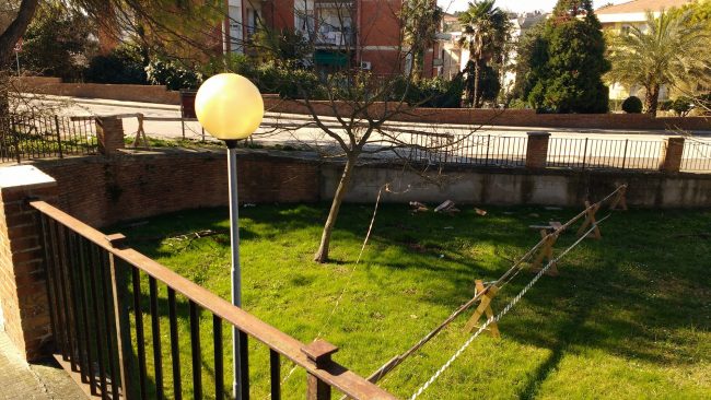 Procedendo verso il lato opposto dell’area “poco verde”, in cui esistono ancora, sebbene malandati, i giochi per i bambini, eccoci in un ampio angolo reso “off limits” dal Comune. Perché parte delle transenne in ferro che lo dividono dalla strada è sparito. Sostituite, alla buona, da una stecca di legno. Un lungo nastro bianco e rosso e una piccola impalcatura, anch’essa lignea, delimitano il “corner della vergogna”, costellato di mattoni e dalle solite cartacce. Una piazzetta-parco fantasma – sabato scorso, a metà mattinata, non c’era un’anima – collegata alla sovrastante via Scandali da una strada ridotta a sentiero-mulattiera. Percorrendola in salita, notiamo che resiste l’impianto sportivo, dove si aggirano dolo un cagnolino con relativa padrona. E da lassù non è proprio un belvedere.