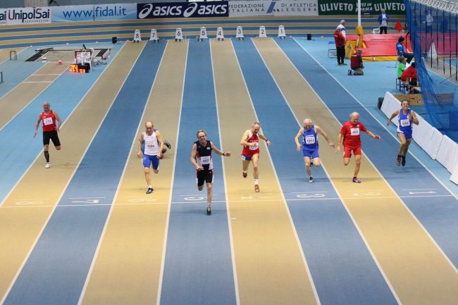 Spettacolari le gare sul rettilineo dello sprint. Nei 60 metri SM55 sfreccia Giancarlo D’Oro (Atl. Ambrosiana) in 7.56, per demolire il record di 7.73 da lui realizzato un mese fa a Modena, e alle sue spalle Enrico Sisti (Romatletica Salaria Village) corre in 7.76 avvicinando il precedente record. Al femminile anche Miriam Di Iorio (Us Aterno Pescara), abruzzese di Vasto, ritocca il suo primato SF50 dell’anno scorso con 8.28. Non finisce di stupire Hubert Indra (Südtirol Team Club), che migliora tre volte il record italiano SM60 dell’asta portandolo a 3,55. Tra i primati nazionali spicca anche quello nei 3000 di marcia SM80 in 18:19.16 ad opera di Romolo Pelliccia (Atl. Libertas Orvieto): “La marcia è una delle migliori specialità per chi si trova in età avanzata – dichiara – perché non è traumatica”. Commerciante di profumi, ha praticato la disciplina del tacco e punta fin dalle categorie giovanili e poi ha ripreso all’età di 30 anni, dopo un breve stop, per mettere a segno una vera e propria collezione di vittorie in campo internazionale. Ma è attivo anche come tecnico, ad esempio di Valeria Pedetti (Atl. Libertas Arcs Cus Perugia/SF40) che si è aggiudicata la prova femminile in 14:27.56 davanti alla pluricampionessa mondiale Tatiana Zucconi (Romatletica Salaria Village, 14:37.34). Notevole anche il crono di Ettorino Formentin (Us Quercia Trentingrana Rovereto), 15:47.85 per il record italiano SM70. Nel lungo SF40 si migliora ancora Sara Colombo (Atl. Monza): 5,38 al primo turno e poi 5,46 all’ultimo salto.