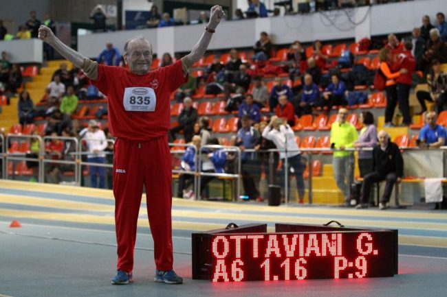 Ancora un Giuseppe Ottaviani da record. Il centenario dell’atletica firma un’altra impresa da primato mondiale nella categoria M100, stavolta nel salto in lungo, agli ultimi Campionati italiani master indoor e invernali di lanci, ad Ancona. Palaindoor in visibilio per il marchigiano Ottaviani, 101 anni il prossimo 20 maggio, che tra gli applausi ed il tifo degli spettatori ha portato a casa un altro successo, festeggiando poi la vittoria con tutto il suo pubblico. Al sesto e ultimo salto della gara, l’inossidabile marchigiano è atterrato a 1,16 m per migliorare il limite che aveva stabilito con 1,08 durante la scorsa stagione, proprio nel giorno del suo compleanno al Palaindoor di Ancona. «Sono davvero contento e felice – ha raccontato – per tutti gli amici che sono venuti qui a salutarmi. Cosa posso volere di più? Sto bene in compagnia di tanta gente che ama lo sport come me e che mi dà la carica per andare avanti. Dobbiamo essere ottimisti e l’atletica ci aiuta ad esserlo». E il pubblico non ha fatto mancare il suo sostegno ed il suo calore durante i 60 m di Ottaviani, 19″25 accompagnati da una vera ovazione.