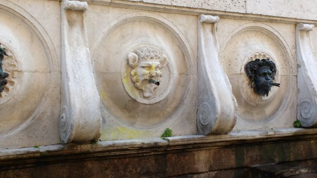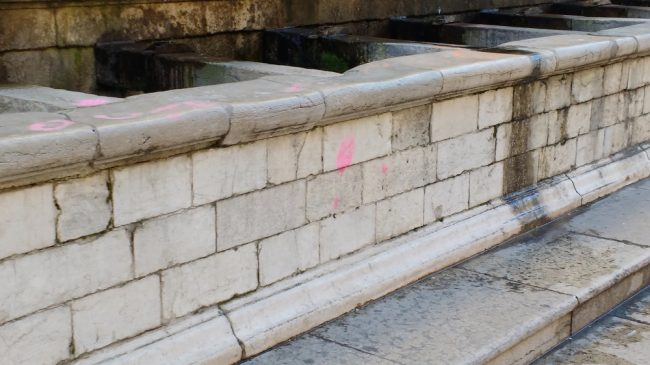 Colpita dai vandali lunedì pomeriggio, la Fontana delle 13 Cannelle è ancora imbrattata dalla vernice spray. Il Comune aveva anticipato che stamattina, mercoledì 1 marzo, il monumento sarebbe stato ripulito da Anconambiente con un apposito getto d’acqua ad alta pressione, senza grandi problemi o danni permanenti alla pietra bianca. E invece i segni sono ancora ben visibili. Nessuna novità nemmeno sugli autori del gesto. Secondo l’assessore Stefano Foresi si sarebbe trattato di una “bravata da ragazzini” e che le immagini della videosorveglianza, ora nelle mani delle forze dell’ordine, avrebbero ripreso tutto. Pronti dunque a segnalare ai genitori i giovani vandali. Ma al momento nessuno è stato ancora identificato.