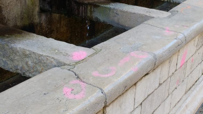 I segni divernice gialla con cui è stata imbrattata la fontana