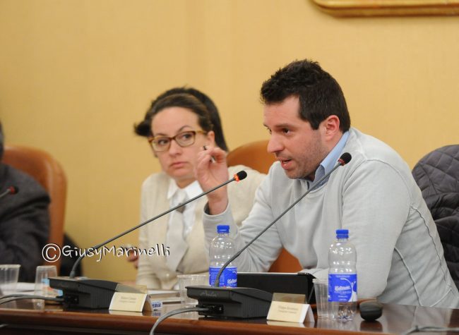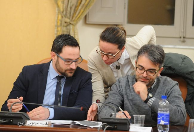 Ancora un’immagine d Eliana Flamini in consiglio comunale ad Osimo, con il capogruppo democrat Giorgio Campanari (a sinistra) e il collega di gruppo Diego Gallina Fiorini
