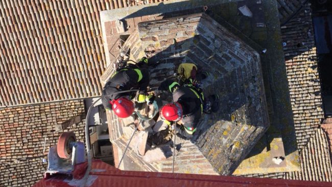 I vigili del fuoco al lavoro sull campanile della chiesa di Sant’Antonio da Padova