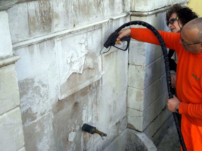 A seguire gli addetti sono passati alla Fontana delle 13 Cannelle dove i graffiti erano stati apposti con materiali diversi. Alcuni, forse realizzati con gessetti, grazie alla pioggia dell’altro giorno, si erano sciolti. Rimanevano alcune tracce di colore su un paio di punti che la Ghibli ha rimosso. Sulla fontana del Calamo,sul bordo di uno dei mascheroni in pietra, è stato necessario eseguire una microsabbiatura aggiungendo al getto d’acqua una polvere di mais per rimuovere una macchia di colore giallo per la quale non era stato sufficiente l’intervento della sola idropulitura.