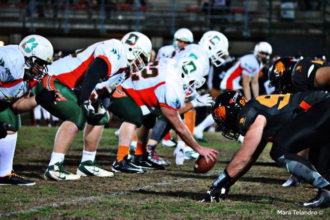 I Campioni d’Italia in carica Rhinos Milano fanno il loro esordio nella stagione 2017 davanti al proprio pubblico opposti ai Gls Dolphins Ancona. La partita, che senza alcun dubbio non è stata mai in discussione, e il punteggio finale parla chiaro 33-7, ha però lasciato aperti alcuni spunti da approfondire. Indiscutibilmente la formazione di coach Ault, allestita in grande stile arruolando, a destra e a manca, buona parte dei migliori atleti sparsi sull’italico territorio, ha blindato nei primi due quarti l’incontro tanto da portarsi sul 19-0 prima dell’ intervallo, ma la formazione dorica avrebbe senza dubbio meritato di portare a casa un risultato differente e più congruo per quanto espresso in campo nella seconda frazione dell’incontro dalla Rotelli- band.