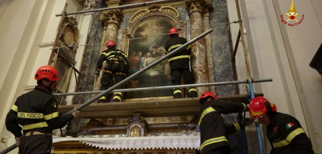 I vigili del fuoco, oggi sono intervenuti a Monte San Vito presso la Chiesa Collegiata per recuperare le opere d’arte e sacre posizionate all’interno della chiesa inagibile dalla scossa dell’agosto scorso. La movimentazione delle opere è stata necessaria per la messa in sicurezza della chiesa.