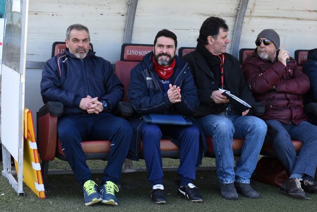 Giovanni Pagliari sulla panchina dell’Ancona contro il Santarcangelo, primo da sinistra inisieme ai dirigenti Nacciarriti e Spadoni