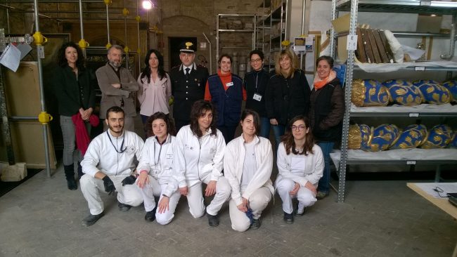 La squadra del laboratorio di pronto intervento e messa insicurezza delle opre d’arte recuperate dai luoghi colpiti dal sisma