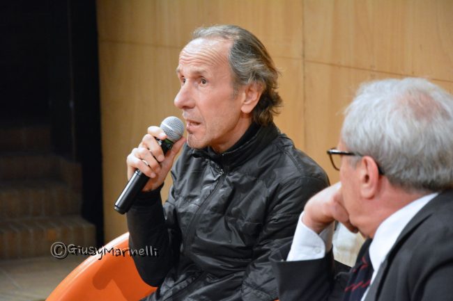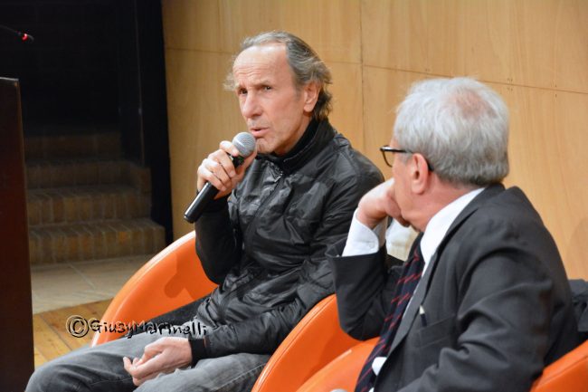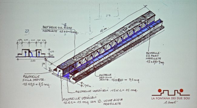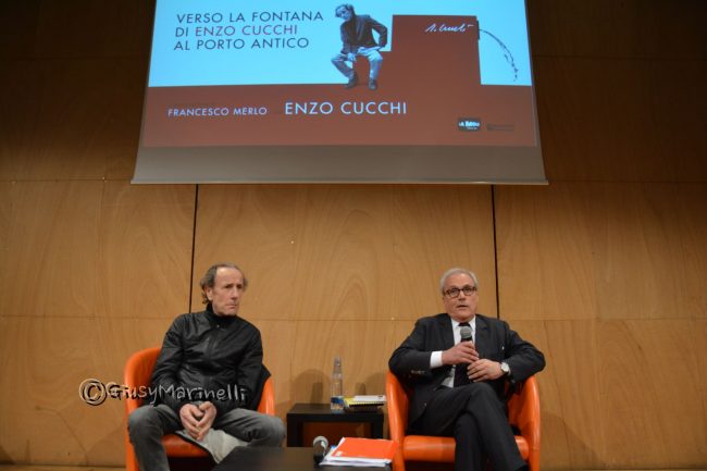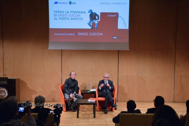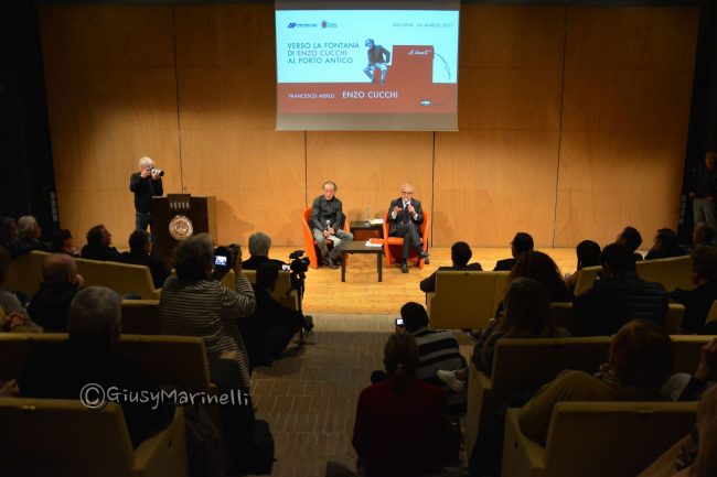 Sarà la “Fontana dei due soli”, riferimento tutt’altro che casuale all’unicità (per la verità contesa) di Ancona: la sola città in cui è possibile vedere il sole sorgere e tramontare sul mare. A svelare i dettagli dell’opera lo stesso Cucchi, intervistato dal critico d’arte Francesco Merlo, al Ridotto del Teatro delle Muse, tra la curiosità del pubblico, interessato a sapere qualcosa di più non solo della fontana, ma anche del suo autore, personalità un po’ ruvida non priva di humor. Tredici cannelle – chiara anche questa citazione – di acqua riciclata, più un’altra nella parte laterale delle vasche, di acqua potabile, per un monumento «praticabile», come lo ha definito lo stesso Maestro, da tutti. Sulle sue due sponde ci si potrà sedere e guardare, sia da un lato sia dall’altro i due lembi di mare che si diramano all’altezza della Rotonda, e la bellezza della storia, raggiungibile anche dai portatori di handicap. Il tema dell’accoglienza, del sollievo, del riposo che necessita dopo l’arrivo in un porto, è l’idea che ha ispirato il Maestro. «Ecco perché l’idea di una fontana dove ci si possa sedere e ritrovarsi in un luogo di memoria storica, ed ammirare la sua ricchezza l’arco di Traiano, Vanvitelli, le mura storiche. È questa la carta di identità di questa città, massacrata, in passato, dall’ignoranza». I lavori sono già iniziati. A giugno la prima acqua sgorgherà dalla scultura monumentale, costata 130 mila euro, metà a carico dell’Autorità portuale l’altra del progetto Mole finanziato da Cariverona. «Un’opera economica, ma di grandissima ambizione e di grandissima bellezza, posizionata in un posto magica», l’ha definita il giornalista e scrittore, firma di Repubblica Merli. A lui il compito di intervistare Enzo Cucchi e di dialogare con lui di arte e di Ancona, città con la quale Cucchi non nasconde un rapporto «non facile. Quando vengo ad Ancona mi sento un frigorifero, ma per la bellezza di come è stata disegnata non avrebbe bisogno di omaggi».