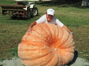 Mario Muscoloni abbraccia una delle sue zucche giganti