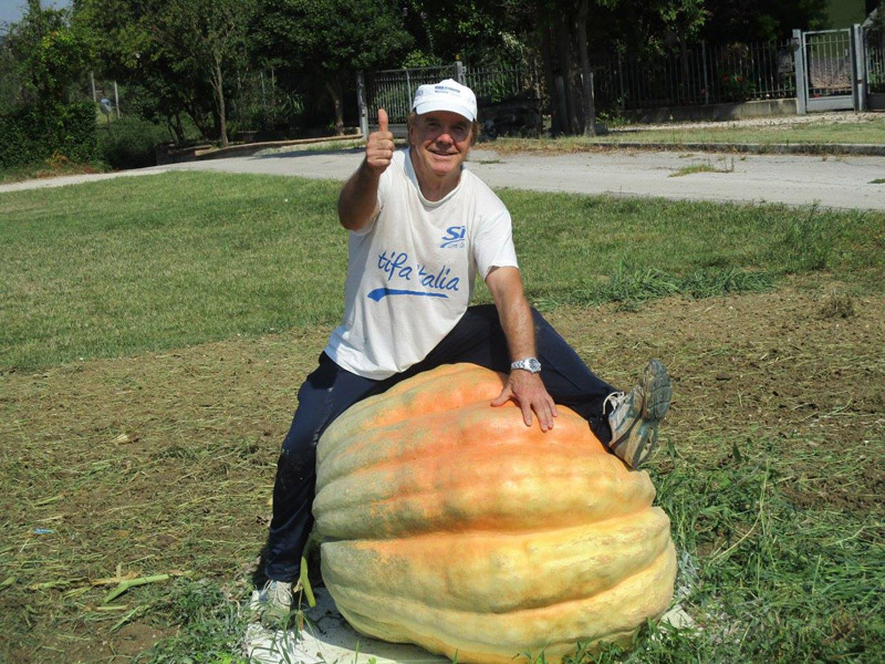 Nelle Marche resta imbattuto il record della sua zucca da 550 chili (quello italiano è 970 kg) cresciuta nel 2015 e dopo tre stagioni di esperimenti, l’anno scorso il ‘Cavaliere delle zucche giganti’, come l’hanno ribattezzato, è riuscito a quadruplicare il raccolto. Si è portato in magazzino una zucca da 422 kg, una da 264 chili, un’altra ancora da 222 kg e una quarta da 126, tutte non commestibili. Quattro mega ortaggi andati persino in tournee per le Marche, esposti alla Festa del Colombaccio di Offagna ma anche alla Sagra della Polenta di Apiro. Adesso la sfida è servire a tavola le fette del mega cocomero, ancora in gestazione. L’appuntamento è per le Feste Medievali 2017 di Offagna.
