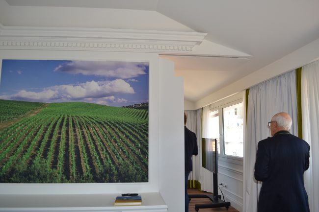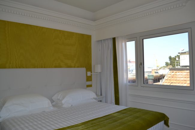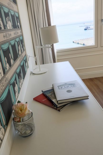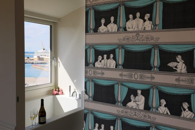Il rosso acceso del tappeto sulla scalinata che porta ai piani alti risalta sugli arredi bianchi, che accentuano la grande luminosità degli ambienti in particolare delle nuove suite (dotati di tutti i comfort più moderni e tecnologici) che dalle loro grandi finestre si affacciano sul porto e sui tetti antichi della città. A dare il benvenuto, nella hall, la parete terra-cielo sulla quale si mostrano tutte le migliori etichette dell’azienda vinicola Umani Ronchi.