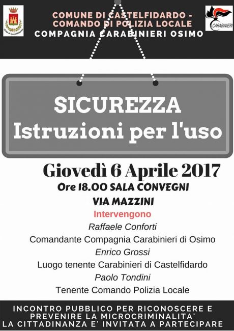 ‘Sicurezza istruzioni per l’uso’ è il titolo dell’incontro pubblico che l’amministrazione comunale di Castelfidardo ha organizzato per giovedì 6 aprile, alle 18, nella sala convegni di via Mazzini. Il confronto con i rappresentanti delle Forze dell’ordine, il capitano Raffaele Conforti, vertice della Compagna Carabinieri di Osimo, il luogotenente Enrico Grossi, comandante della Stazione carabinieri di Castelfidardo e il tenente Paolo Tondini, vice comandante della Polizia Municipale di Castelfidardo, sarà utile per fornire ai cittadini tutte le informazioni necessarie in tema di sicurezza e per analizzare gli interventi necessari ad arginare il fenomeno furti. La ‘mutualità di vicinato’, un controllo più attento dei vicini, è uno degli strumenti che aiutano a difendersi alla criminalità diffusa.