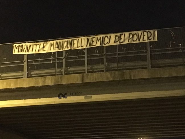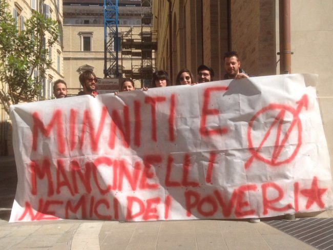 “Minniti e Mancinelli odiano i poveri”. Questo uno degli slogan scelti dalle associazioni e dai movimenti Ora, spazio Heval, centro sociale Asilo politico e Ancona bene comune per contestare le ultime misure prese dal governo e dal Consiglio comunale in materia di decoro urbano. Il ministro dell’Interno è criticato per il decreto legge che dà ampi poteri a sindaci e prefetti in nome della sicurezza (leggi l’articolo), il sindaco invece è contestato per l’articolo 11 del regolamento comunale a tutela del benessere degli animali (leggi l’articolo) appena approvato, che prevede multe da 77 a 500 euro per chi utilizza animali per l’accattonaggio. Vietato in particolare “utilizzare o esibire” animali di qualsiasi specie e età per chiedere l’elemosina. Nel caso del cane, può anche essere ritirato al clochard, e riconsegnato solo se trovato in buona salute e dotato di microchip. “Entrambe misure dal contenuto altamente repressivo con lo scopo ben preciso di combattere apertamente una lunga serie di categorie di persone – scrivono i manifestanti nel loro volantino -. Mendicanti, poveri, migranti, prostitute, manifestanti, tifosi diventano nemici dello stato, vittime potenziali di fogli di via, mini daspo, arresti preventivi, multe pecuniarie. Una lunga serie di provvedimenti che fanno dello stato il miglior cane da guardia dei peggiori populismi intolleranti”. Il messaggio è stato lanciato durante un volantinaggio nella mattinata in piazza Roma e corso Garibaldi, mentre nella notte diversi punti della città sono stati issati striscioni con slogan contro il sindaco e il ministro. “Uno stato che rinuncia a costruire Welfare, integrazione, socialità per trasformare ogni contesto in un problema di ordine pubblico. Contro questa idea securitaria di società continueremo ad essere in piazza ed al fianco dei più deboli, vittime preferite di questo potere politico-economico sempre più violento” scrivono le quattro sigle.