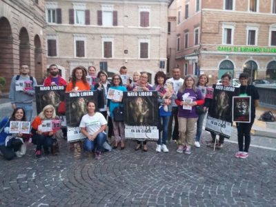 Gli attivisti di Amici Animali con i cartelli in piazza Boccolino davanti all’entrata del consiglio comunale di Osimo