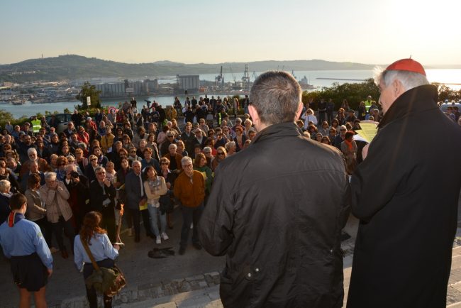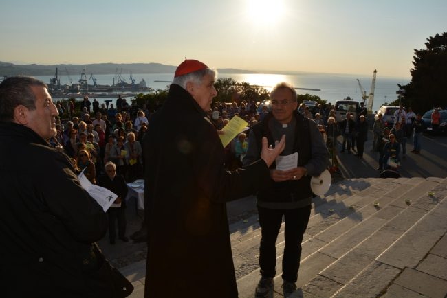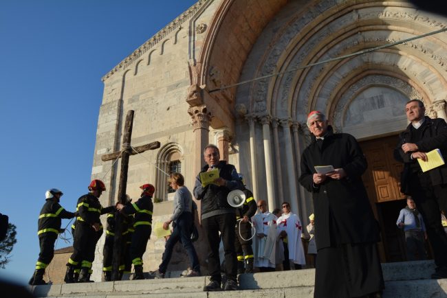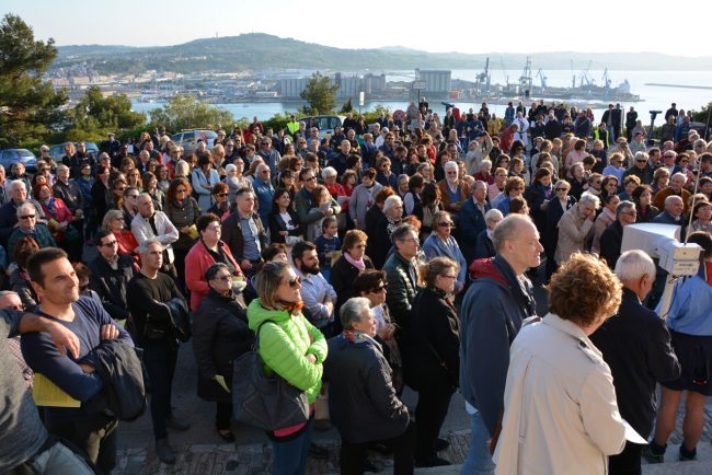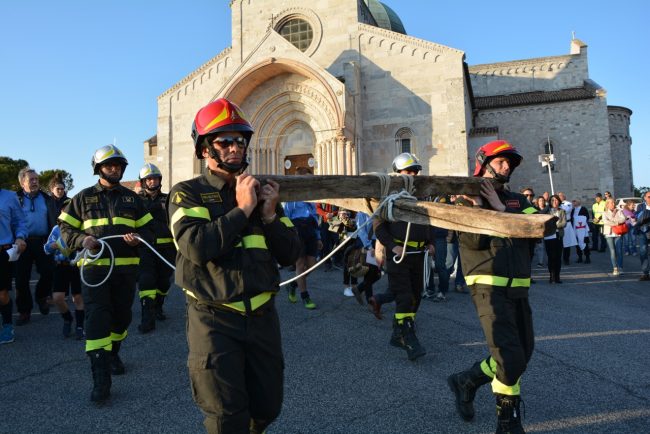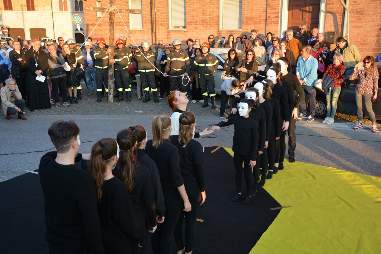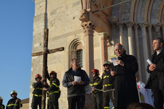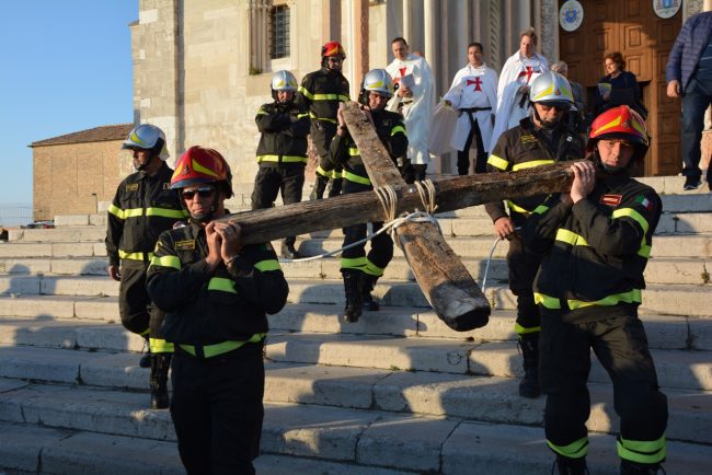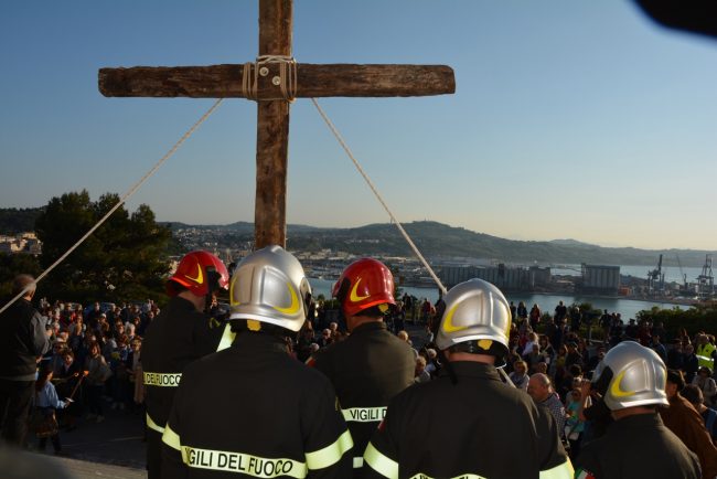 La croce fatta con il legno delle case distrutte dal terremoto e portata dai vigili del fuoco del Comando provinciale di Ancona, le maschere per ricordare i tanti anonimi dispersi in mare in cerca dell’approdo. Due simboli per dedicare i riti della Pasqua di quest’anno ai fenomeni di attualità che hanno colpito tanti italiani e stranieri. La Via Crucis partita alle 18,45 dal Duomo e con conclusione in piazza del Plebiscito, al termine delle stazioni lungo le vie del centro, quest’anno è stata idealmente dedicata a sfollati e migranti, con i simboli voluti dal cardinale Edoardo Menichelli. Una folla di anconetani ha partecipato alla processione del venerdì santo.