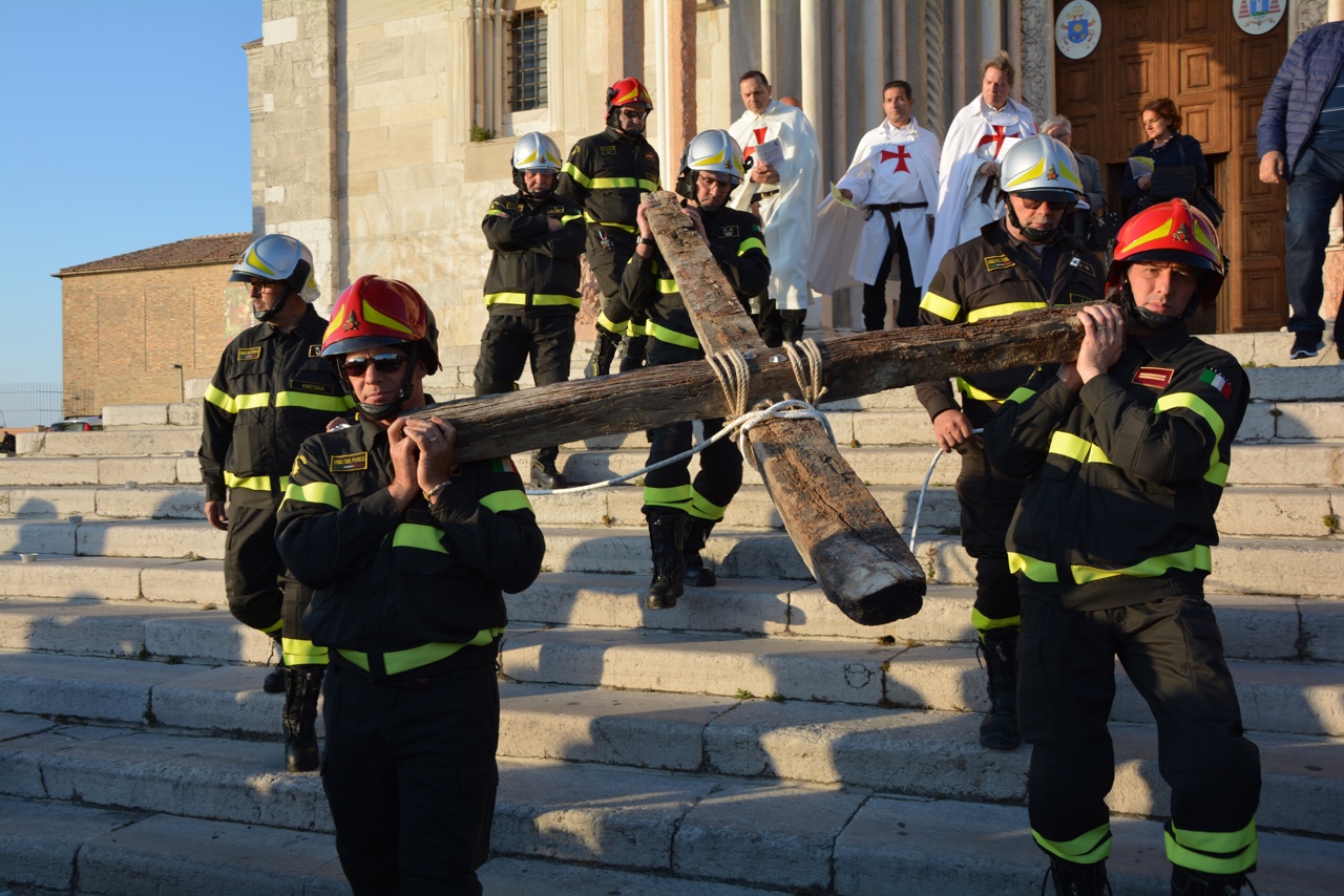 La croce realizzata e portata in processione dai vigili del fuoco del comando provinciale di Ancona