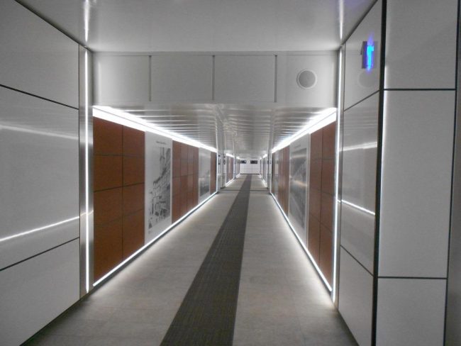 Nuovo look da 350 mila euro per il sottopassaggio della stazione centrale di Ancona, diventato più luminoso, hi-tech, funzionale e migliorato nell’estetica. Completamenti rinnovati gli interni con rivestimenti in laminato plastico e pareti ventilate, illuminazione a Led, pavimentazioni in materiale antisdrucciolo e percorsi tattili per ipovedenti, teleindicatori con display a messaggio variabile e in tempo reale per l’informazione al pubblico. Alle pareti alcune riproduzioni fotografiche con immagini della stazione degli anni ‘30, di alcuni edifici pubblici e vedute della città di Ancona.